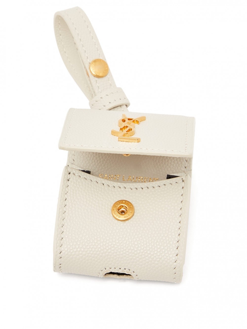 ▼「Saint Laurent」法國奢華時尚品牌這次也推出全新的AirPods保護套,純白荔枝皮革設計,金色的LOGO搭配金色鈕扣吸睛點綴,還有一個小吊帶,讓你勾在手上不怕掉!