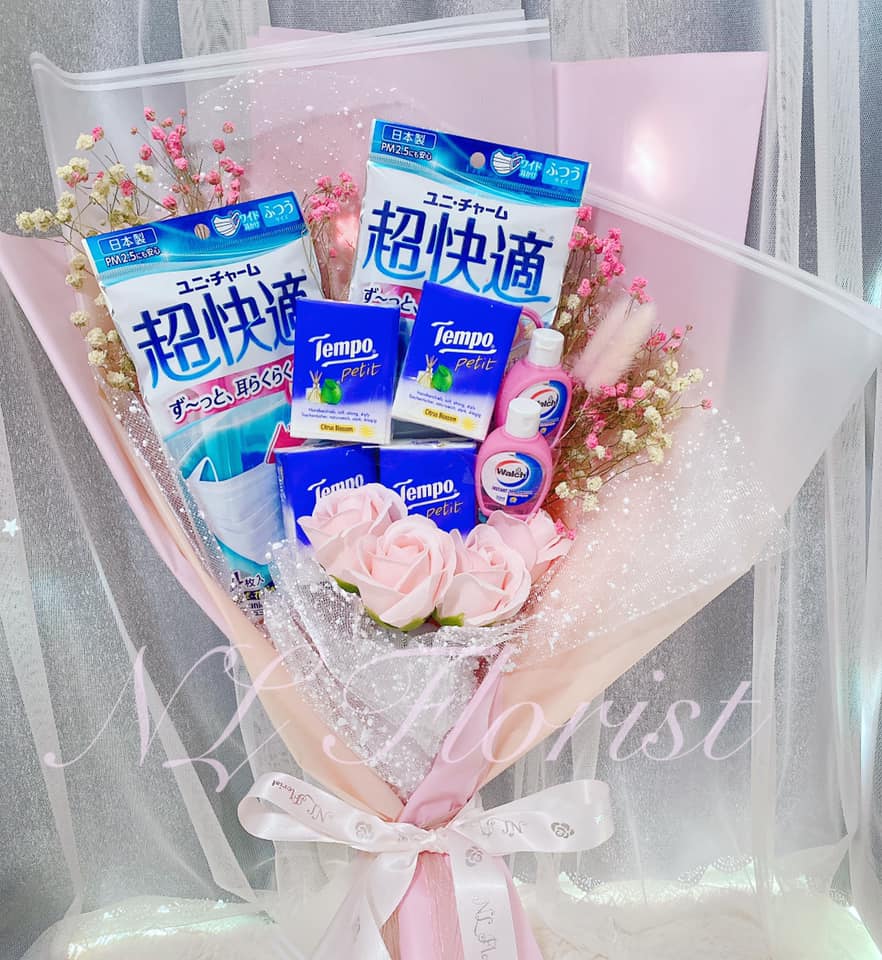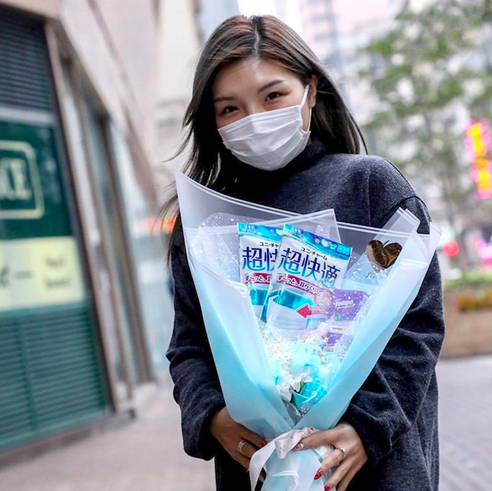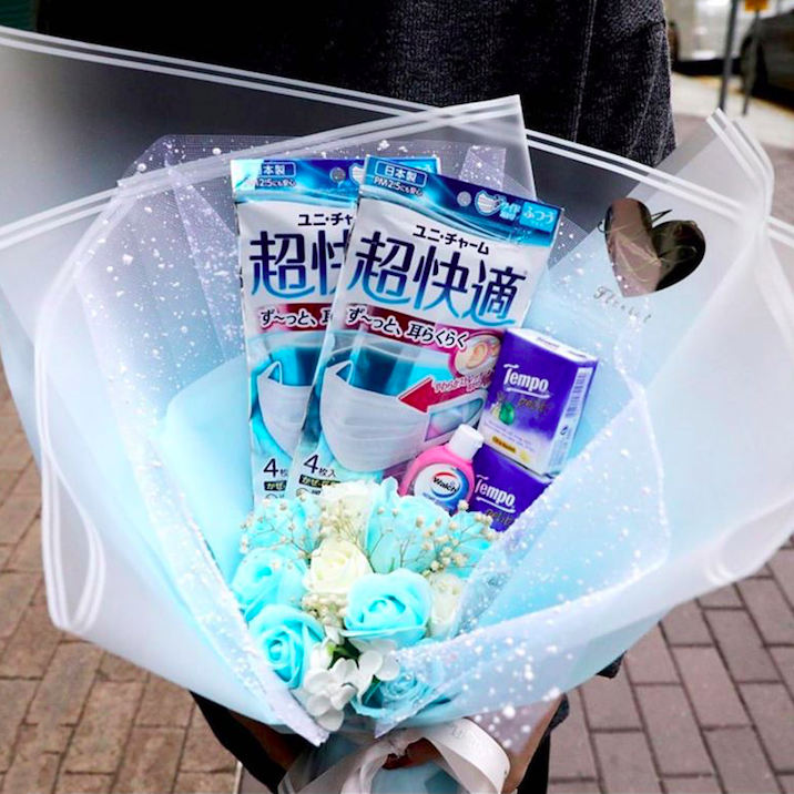 2020年02月15日因為武漢肺炎的影響,今年的情人節格外與眾不同。只送普通的鮮花不夠表達心意,網上花店NL Florist有新創意。他們將現在緊俏的日本口罩、乾洗手和紙巾組合起來,連同鮮花一起包裝,製成「口罩花」出售,結果大受歡迎,花店的生意額足足增長了1到2成。