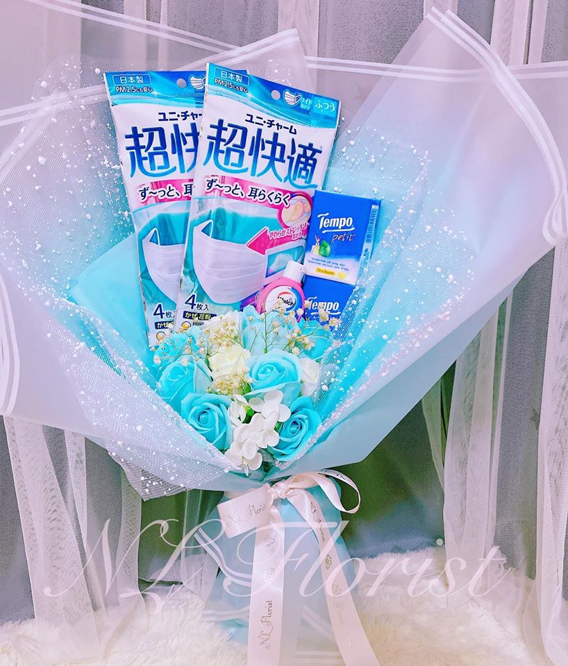 ▼「口罩花」中有10支香皂花,分為粉紅色、粉藍色和深粉紅色三款,還有2包日本「超快適」口罩,共有8個口罩、4包紙巾和2支乾洗手,價格為港幣599元(約台幣2,315元)。買家也可以選擇鮮花代替。