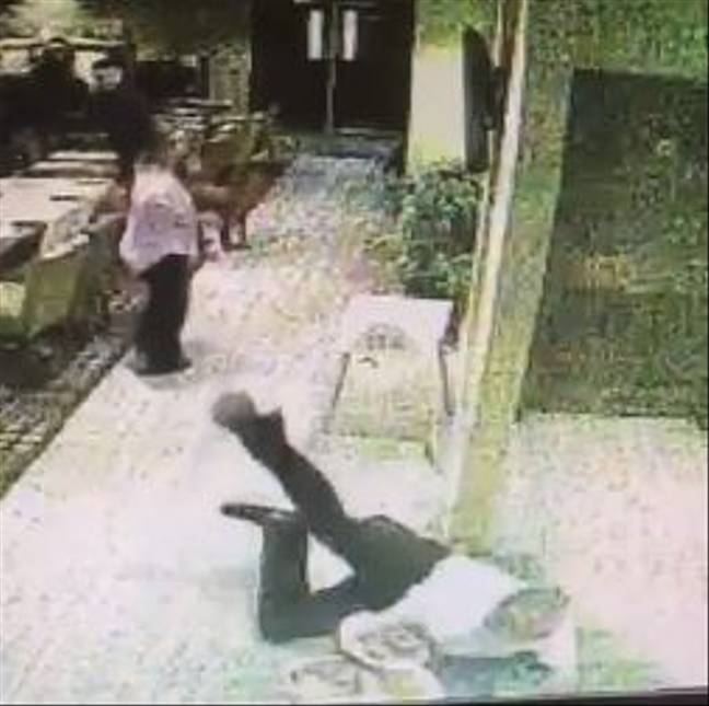 ▼Jamie倒下時碰到旁邊的盆栽,現場一片狼藉。但他反應很快,倒下的同時轉動身體、舉高手臂,手中的料理沒有掉到地上。同事們過來關心他時,他把其中一盤菜遞給身後的同事,然後淡定站了起來。