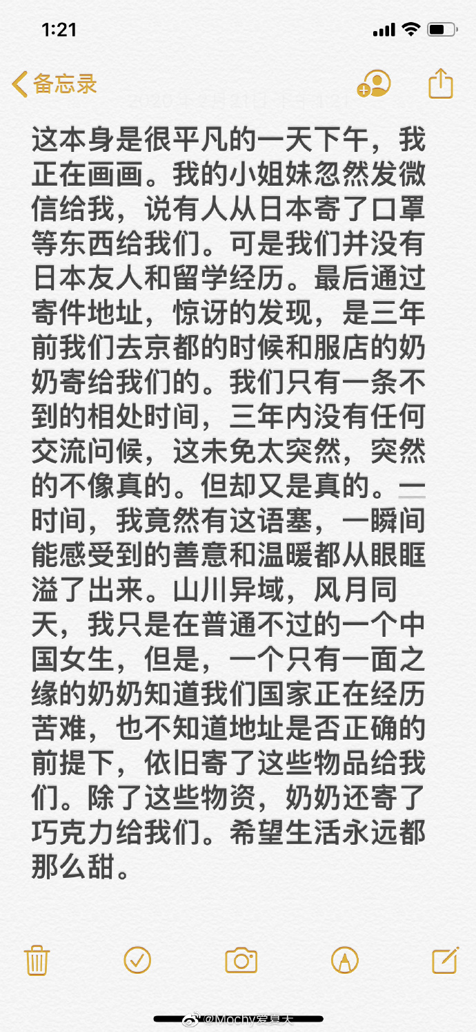 ▼這名女孩在微博上分享了這件暖心的事。她表示那天她和朋友突然收到日本寄來的口罩物資,兩人都沒有日本朋友,也沒有在日本留學的經驗,所以覺得很奇怪。看過寄件地址後,她們才發現那是3年前去京都旅行時租和服店的婆婆寄來的。