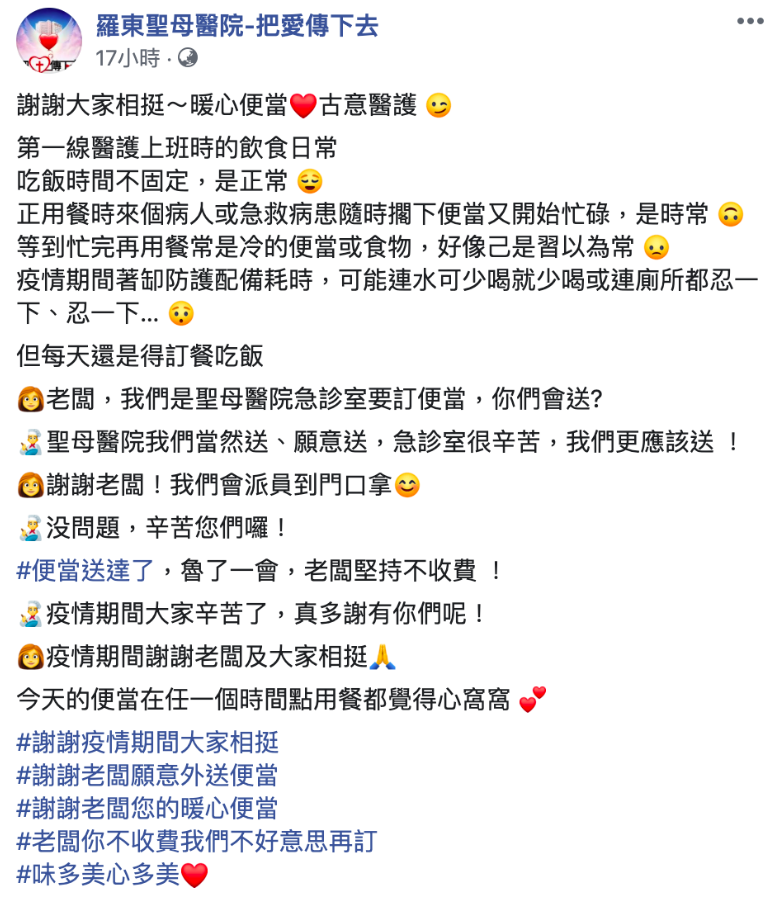▼羅東聖母醫院在臉書po文說,因為疫情嚴峻,第一線醫護的工作量非常大,但再忙也要吃飯。為了防止拒送便當事件再次重演,他們通過電話訂便當時都會很小心地說:「我們是聖母醫院急診室,您們願意送嗎?我們可以派人到門口拿…」