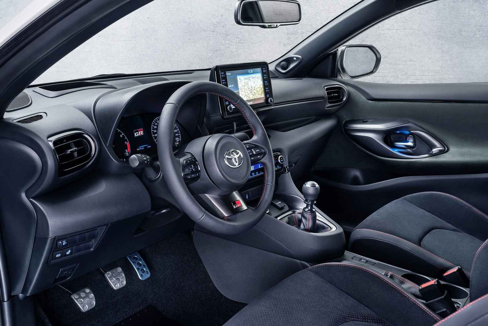 ▼車內多處有GR專屬銘牌,還有麂皮混搭皮質的跑車化座椅,運動感十足。排檔座前方是模式切換旋鈕,還有「Track」賽道模式,這在其他TOYOTA車款中很少見。GR Yaris採用1.6升3缸渦輪引擎,實際排氣量為1618c.c.,可輸出272匹馬力。