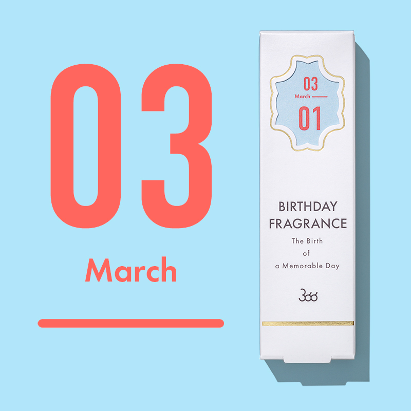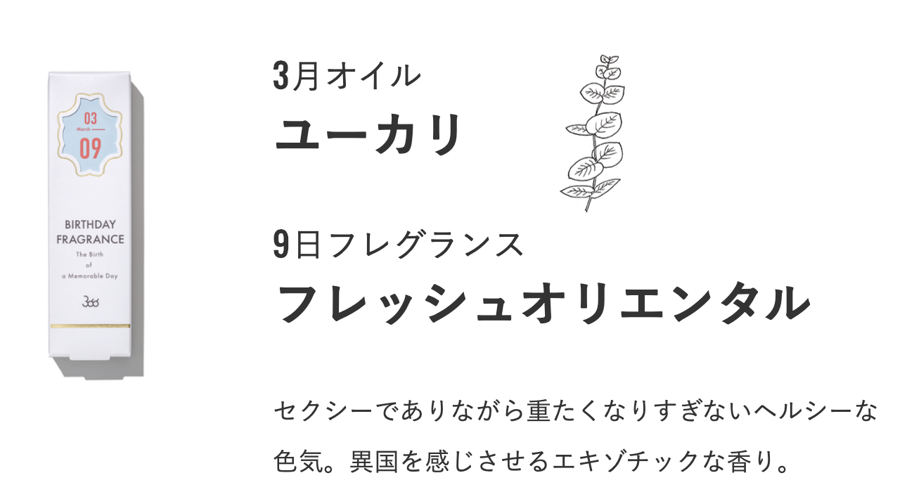 ▼假使送對方一瓶生日的香氛,以3月9日為例,3月是尤加利樹精油,搭配9日的香氣則是清新東方調,健康清新中略帶色氣感的異國香氛。每個不同月份搭配不同的精油,日期則應對各個不同香氣,精油有例如:迷迭香、薄荷、檸檬、葡萄柚等等精油,香氣則是有:綠茶、蘋果、茶花、洋甘菊等等香氣。