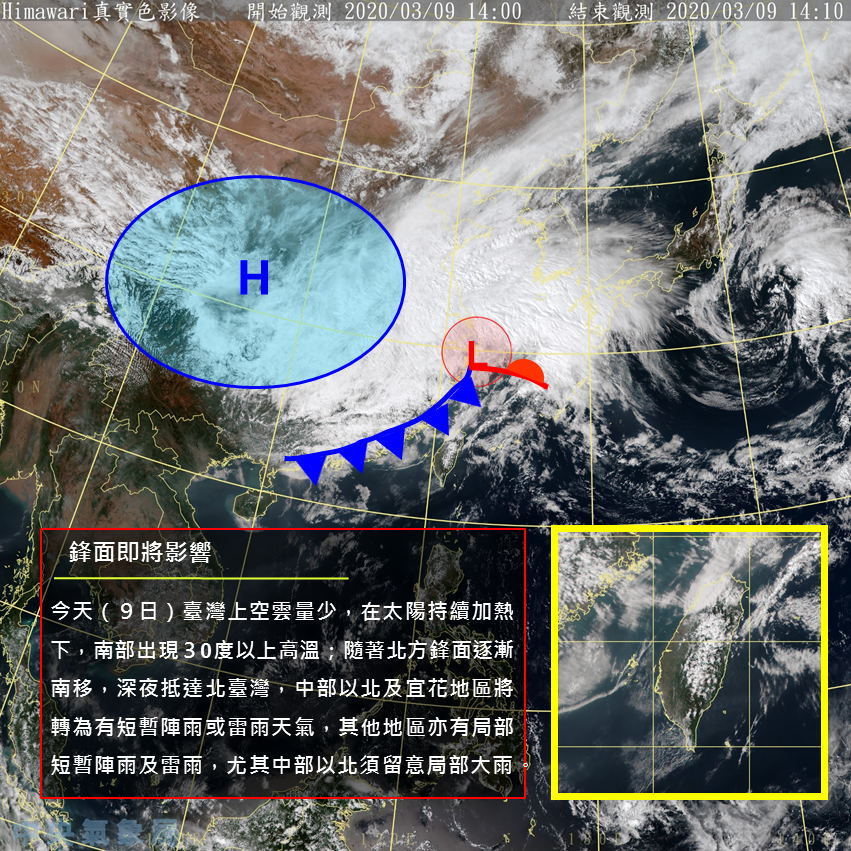 2020年03月10日9日週一全台有雨,深夜鋒面接近氣溫下降,週二10日天氣因鋒面的通過和東北季風增強,全台各地轉為陣雨、雷陣雨,尤其以北部、東北部及東部降雨較為明顯,有局部大雨發生的機率,氣溫越晚越冷。週三(3/11)為最冷,北台灣氣溫僅14、15度,週四(3/12)恢復穩定回暖;週五(3/13)下午起到週六(3/14)因第二波冷空氣南下,中部以北有、南部有局部短暫雨,各地氣溫會驟降。