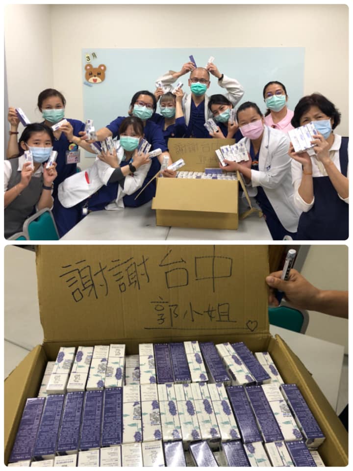2020年03月11日近來肺炎疫情持續,有賴許多第一線醫護不辭辛勞守護大家;日前有醫師發文表示有許多護理師的手,因為多次反覆消毒的乾澀,而進一步造成乾裂,就有一位台中郭小姐非常暖心地提供了大量的護手霜給醫院,更表示還有其他醫院單位需要的,歡迎留言告知數量,她會再寄過去,心地善良引起網友們一片大讚。