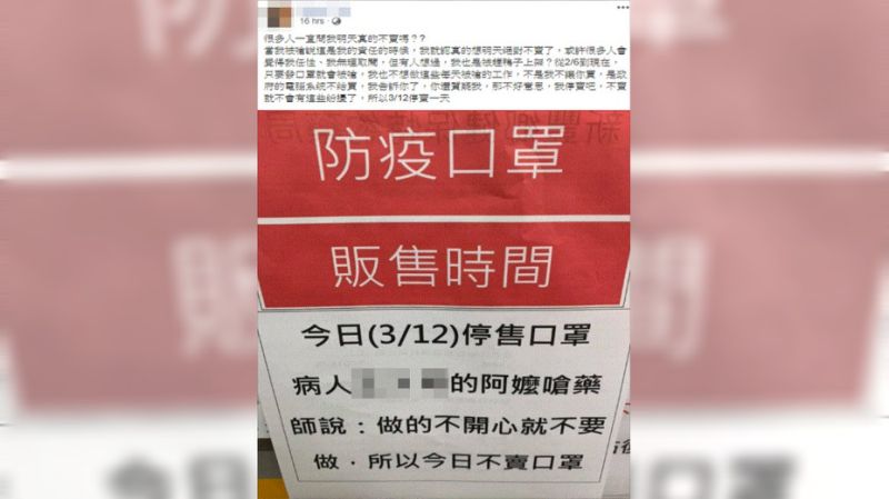 阿嬤買嘸口罩嗆聲「不爽不要做」 藥師「聽話」霸氣貼公告:今日不賣口罩!