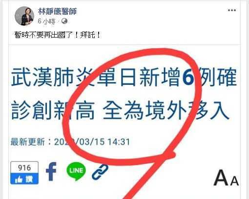 ▼對於台灣新增的6起「境外移入」案例,陳時中在記者會上說:「生活總是要過,但是到國外去過,我覺得不如在台灣過,台灣相對的安全很多!」他表示:「非必要的出國還是要避免,這段時間大家就忍一忍啦!」具有醫師背景的民進黨前立委林靜儀也在臉書勸阻民眾:「暫時不要再出國了!拜託!」