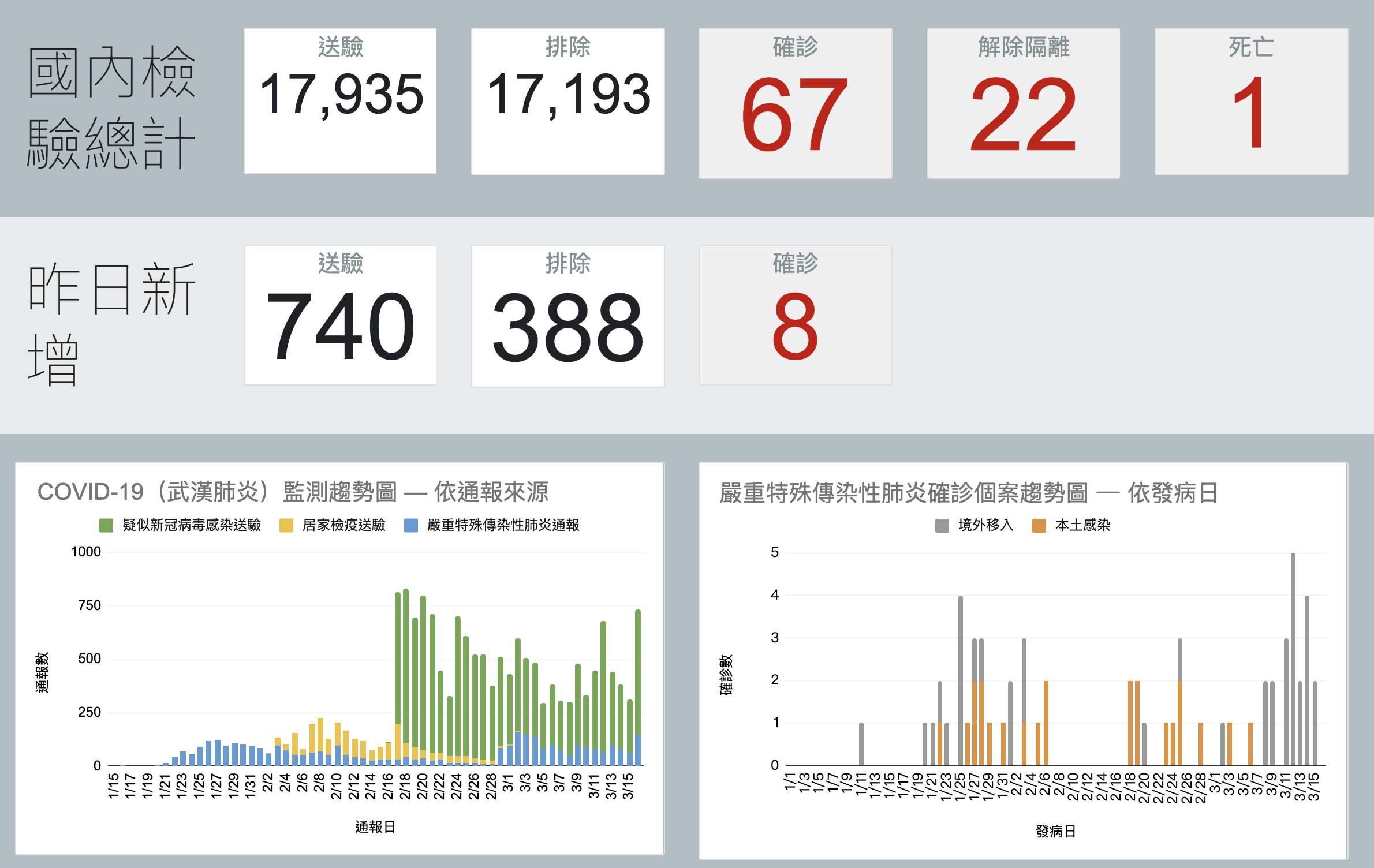 2020年03月17日中央流行疫情指揮中心在16日公布國內新增8起(案60至案67)確診,其中8起皆為境外移入,共計5女3男。案60於3月5日至9日期間入住德國青年旅館,同房旅客狂咳不止,由兩人共用衛浴且未戴口罩,研判在當時遭傳播機率較高。