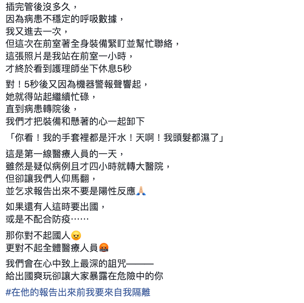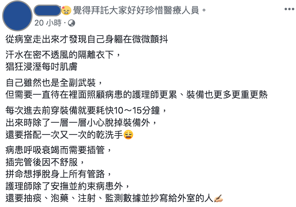 ▼全文描述了醫護隔離衣厚重且不通風、好幾次的乾洗手,一直到協助患者抽痰、注射,直到結束後已是滿身大汗,卻還需要自我隔離等到患者檢驗報告出爐等,曝光了第一線醫護的忙碌、勞累與辛酸,希望大家能好好珍惜醫療人員,讓人看了十分不捨;文末他更直言「如果還有人這時要出國,或是不配合防疫,那你對不起國人,更對不起全體醫療人員。」