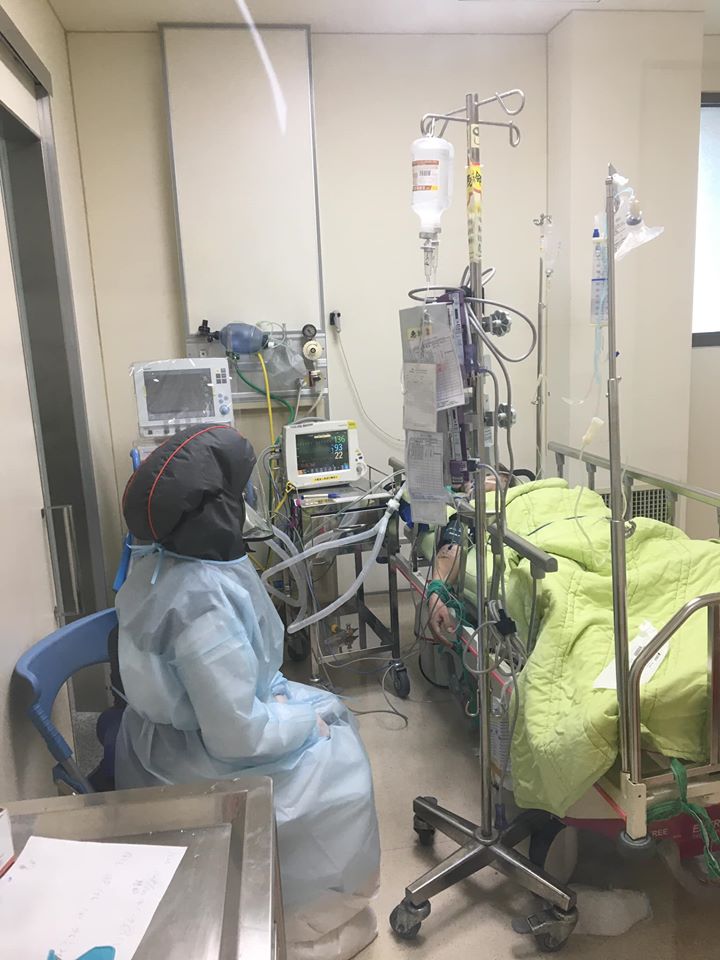 ▼一名網友在Facebook上po出這張照片,表示照片中坐著的護理師在這個小時才剛坐下休息,隨後不到5秒又馬上有機器警報聲響起,又得站起來忙碌,全因這名尚未確診的疑似案例,就造成院內人仰馬翻。