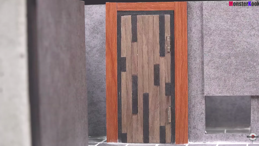 ▼3.門和瓷磚:做一個黑棕斑紋的門裝到微型豪宅上。