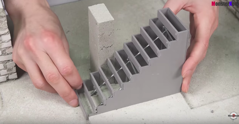 ▼做樓梯必須很細緻才行,用塑膠板做樓梯模子,支到鋼筋框架上面。