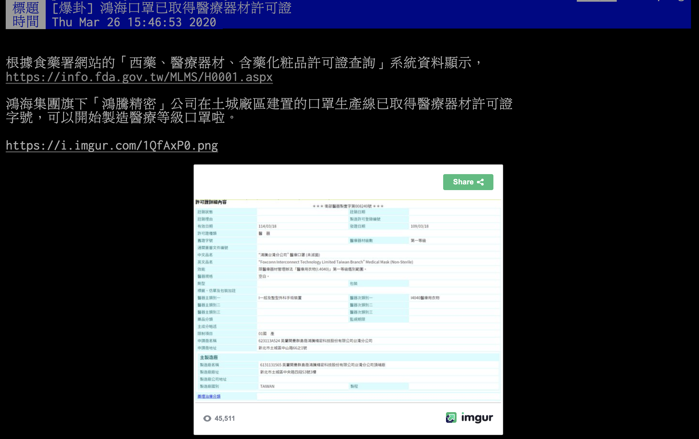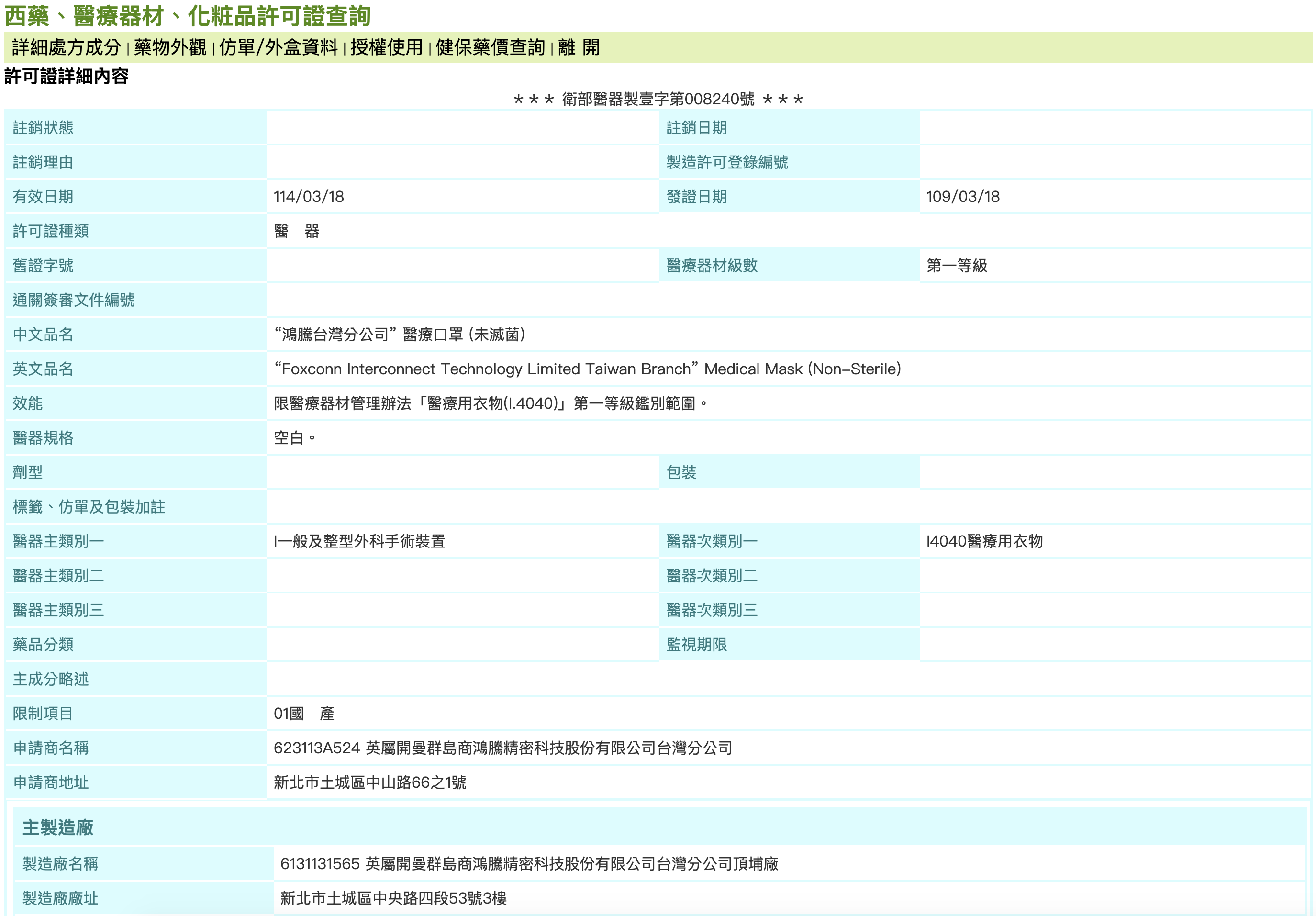 ▼PTT就有眼尖網友發現在3月18日台灣衛福部食藥署的「醫療器材許可證資料庫」系統裡,鴻海旗下子公司「鴻騰精密」已取得生產醫療口罩的許可證字號。據消息指出,鴻海內部會議決議要在台引進口罩產線,並落腳在新北土城區。