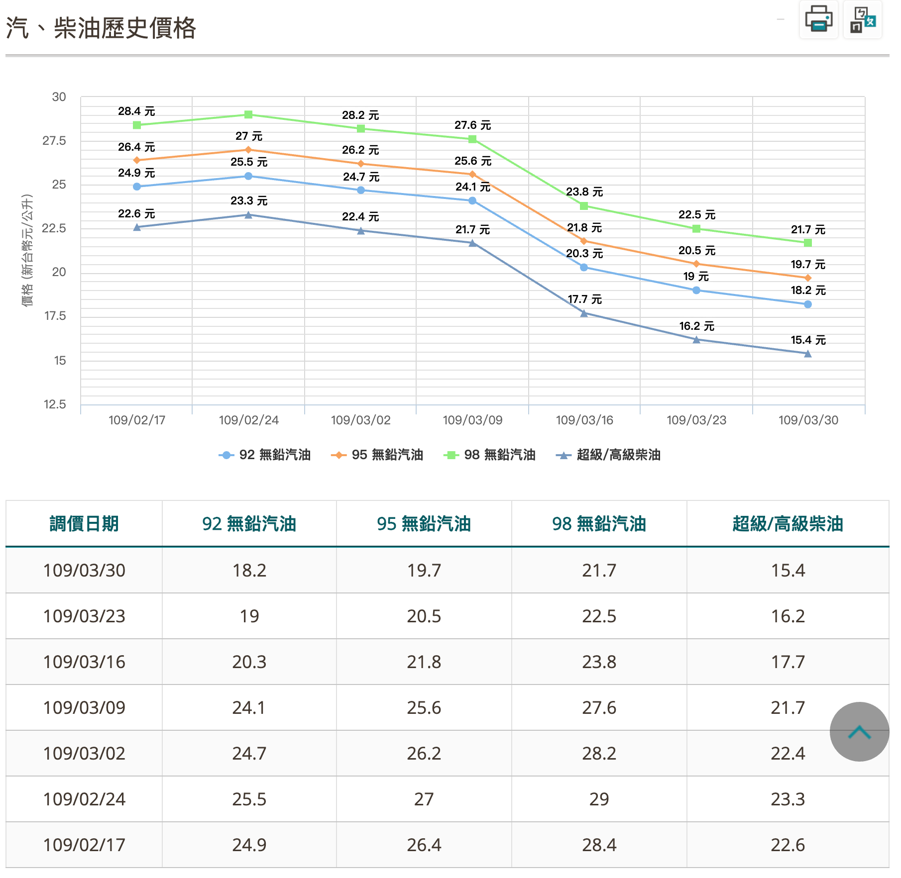 2020年03月30日國際情勢持續下看,國內也因應國際形勢下調油價,這次調降將創下17年來的新低,讓汽機車族都撿到了便宜!台灣中油宣布,3月30日零時起,汽、柴油又向下調降了0.8元/每公升,調整後參考價格為92無鉛汽油每公升18.2元、95無鉛汽油每公升19.7元、98無鉛汽油每公升21.7元、超級柴油每公升15.4元。