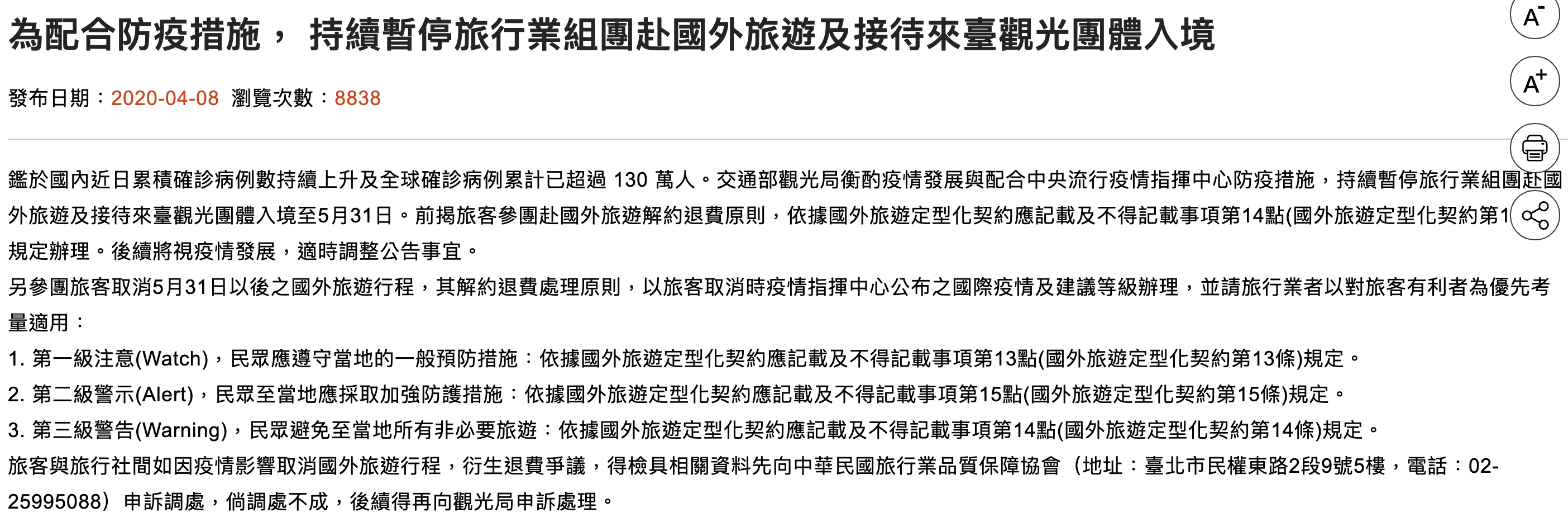 2020年04月09日COVID-19持續擴散,影響了各行各業,其中旅行觀光業是一大受影響的產業,交通部觀光局就在4月8日晚上宣布,將持續暫停旅行業組團赴國外旅遊、接待來台觀光團體入境業務至5月31日。