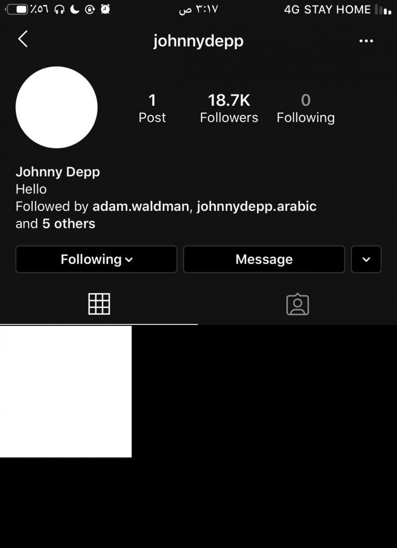▼這個疑似強尼戴普本尊的IG帳號剛剛開設時非常簡單,不僅大頭貼是空白的,簡介上只寫著「哈囉」,就連po出的第一站照片都是完全空白的!