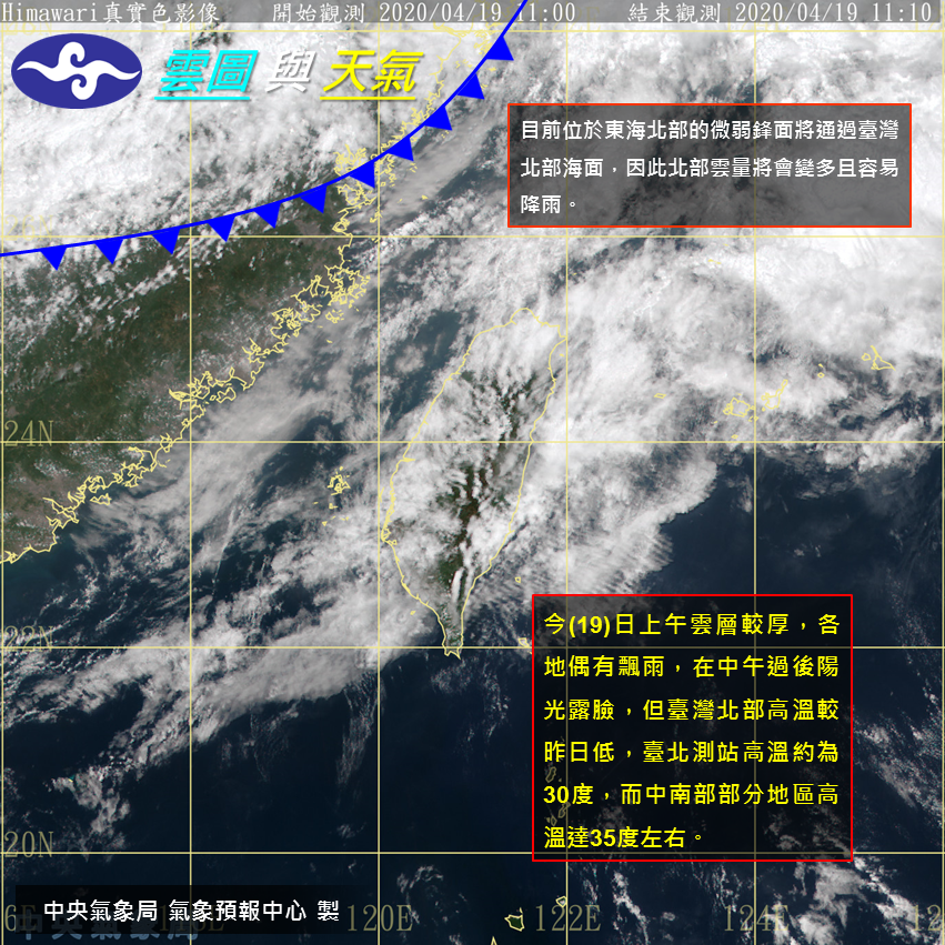 2020年04月20日這幾日來雖然天氣回暖變熱非常多,但據中央氣象局報導,21日起另一鋒面會通過,東北季風增強,所以北部、東半部地區及中部山區會有局部短暫陣雨,其他地區為多雲,有專家分析:21日下午起,氣溫會逐日漸降,24日會降至最低溫,最低溫會來到15、16度;水氣也多,天氣會轉為「濕涼」。