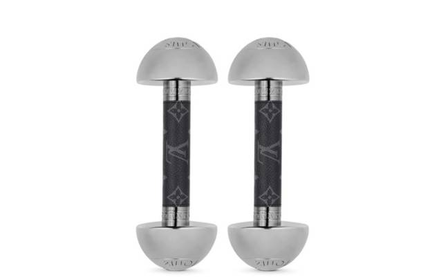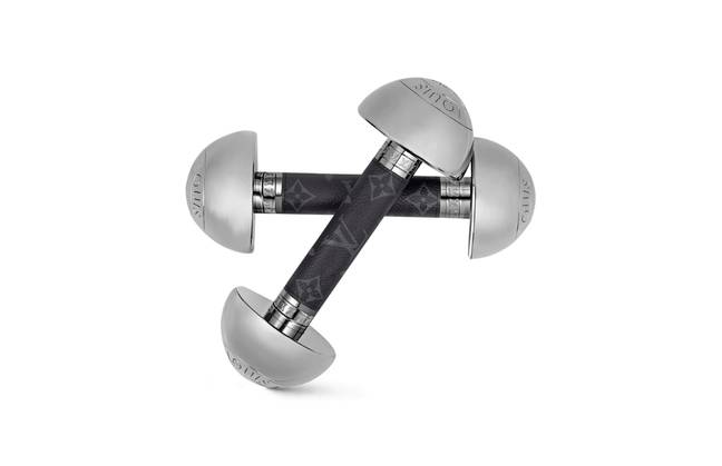 ▼先來看看LV的這款啞鈴,都是用光澤金屬製成的,手柄是LV經典的Monogram Eclipse帆布,兩端還刻有「Louis Vuitton」的字樣。