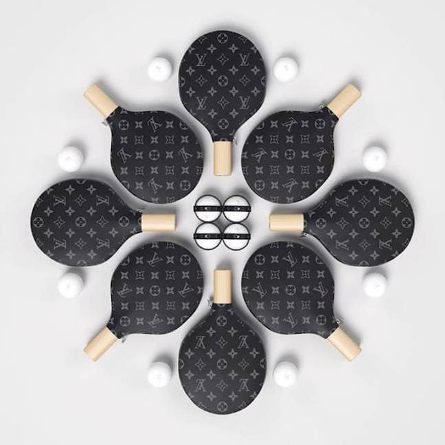 ▼LV的奢華乒乓球拍套裝也上架了,每一組有2支球拍,還有經典的黑灰色Monogram Eclipse圖樣球拍套,並附贈4顆乒乓球。球拍和球的細節都很考究,價格為2200美元(約台幣6萬6千元)。