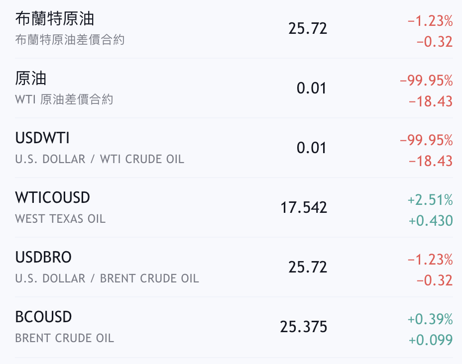 ▼原油定價的兩個主要基準是美國的WTI和英國的布蘭特。WTI和布蘭特之間的差異不僅包括價格,還包括油類,WTI產的原油具有不同的密度和硫含量。這次國價油價大崩盤,WTI週一降幅超過300%,為1983年4月開始編纂油市期貨數據以來首見「負值」。