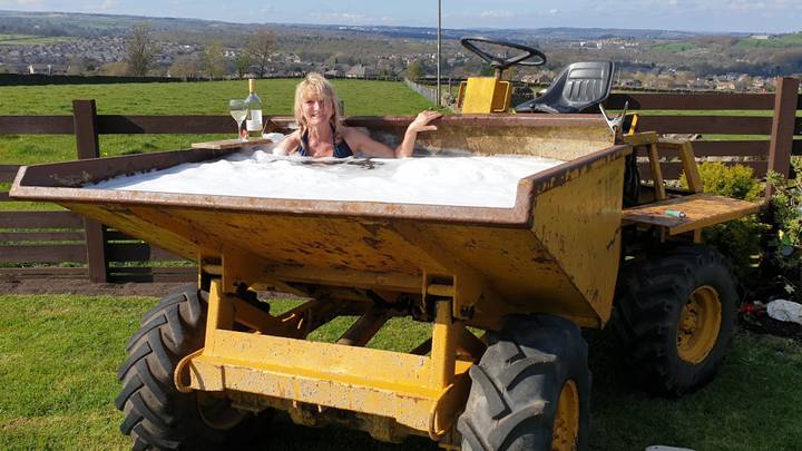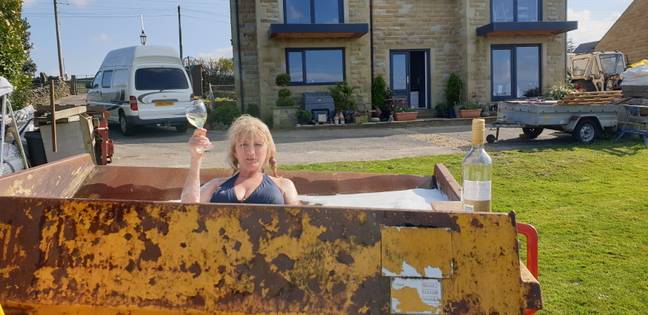 家裡沒有浴缸,就用砂石車的車斗泡澡,這對夫妻真的超狂!Helen一邊泡澡一邊享受美酒,還能看風景,這完美的體驗讓人非常羨慕啊~