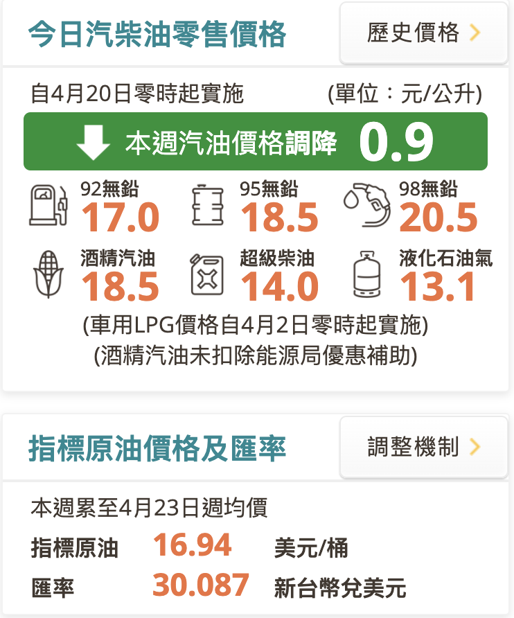 2020年04月24日全球受到新冠影響,石油期貨價格在西德州中級原油(WTI)收價-37.63美元,史上首見負油價創了歷史紀錄。因應國際油價的波動,對此根據中油油價調整的機制推算,下週每公升汽、柴油將再向下調降,預計會各降1元、1.1元,將創下20年來國內新低油價紀錄。