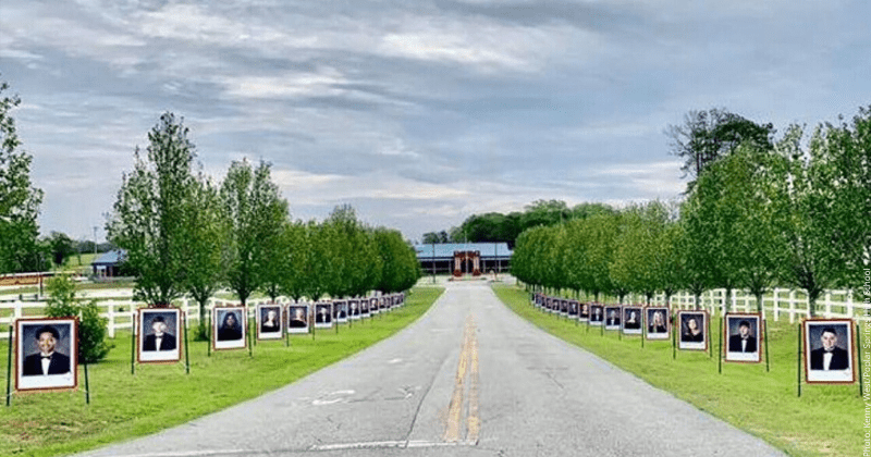 ▼校長認為畢業典禮、畢業舞會是人生中的大事,錯過的話非常可惜。他請攝影師將30位畢業生以前拍攝的肖像照放大,並列印出來,擺在車道兩側,遠遠看去非常壯觀。