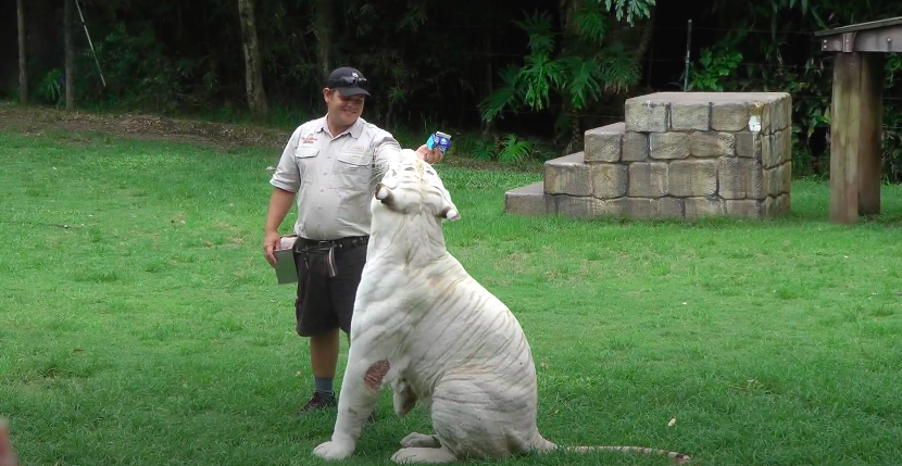 ▼這隻老虎本來趴在草地上休息,飼育員拿著一盒牛奶過來,牠立刻起來討奶喝。飼育員舉起牛奶,老虎順勢用後腿站立,伸長脖子喝奶。