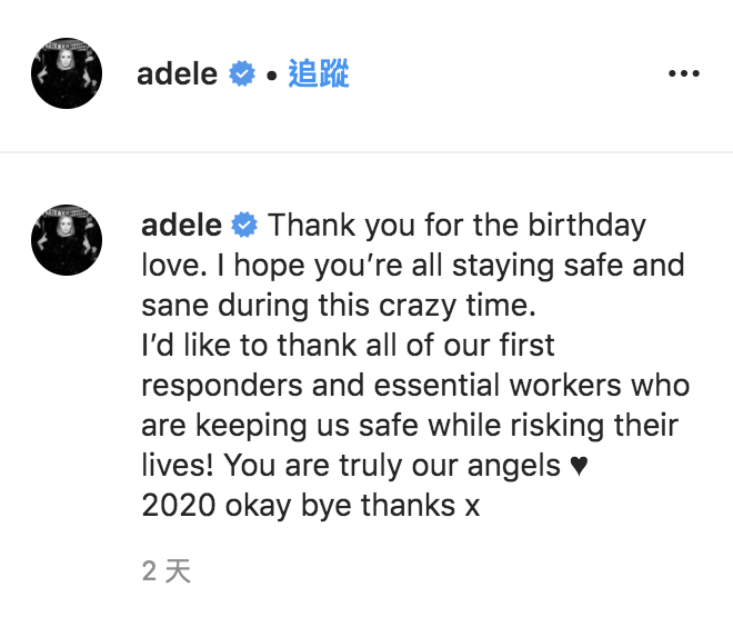 ▼愛黛兒表示:「謝謝大家的生日祝福,希望你們都在這個特別時期保持健康與安全。我也要向所有在第一線工作、冒險來保護我們大眾安全的醫護人員與研究人員們致謝,你們都是天使♥」