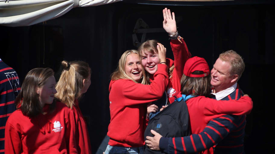 ▼他們花5週橫渡大西洋,期間老師會監督他們完成課業,閒暇時間則在甲板上觀賞海豚,或舉辦團體活動,還要分工清潔船身。帆船駛入港口,學生們與親人終於團聚了: