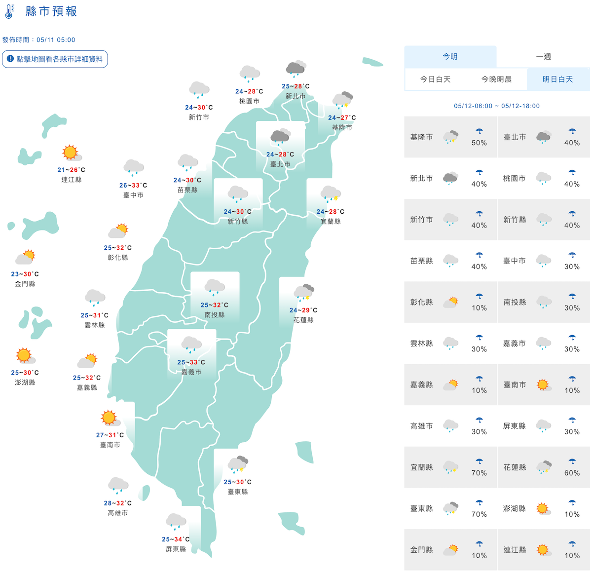 ▼根據氣象局表示,因為梅雨鋒面通過與東北風影響,週一、二中部以北、東北部會雨勢較大,而其他地區亦有局部短暫陣雨甚至雷雨,並有局部豪雨發生的機率。