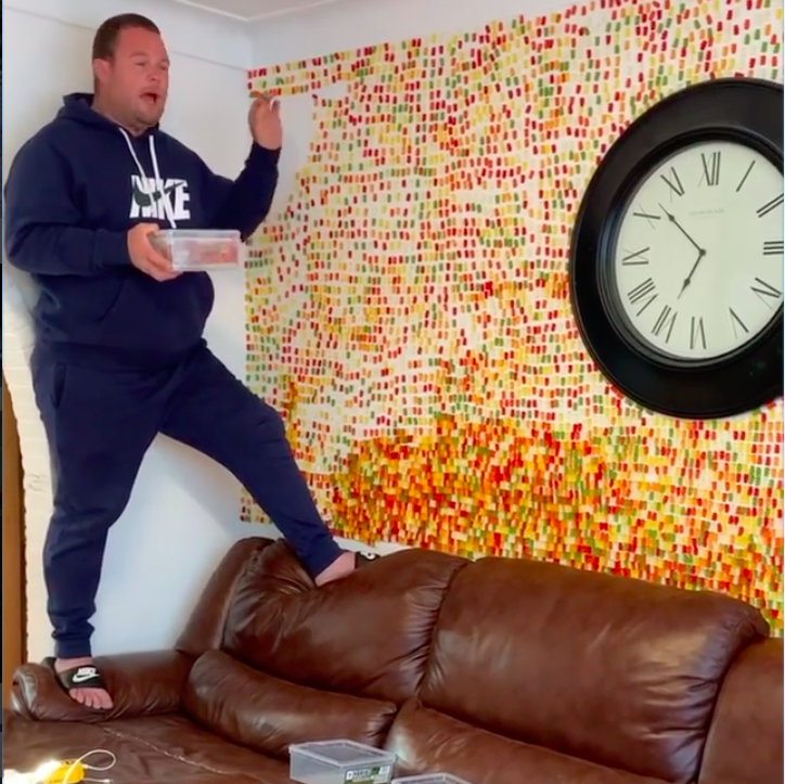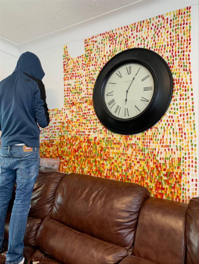 ▼Nick說他有一個開雜貨店的朋友,店裡的一批小熊軟糖過期了,準備丟掉。他把這些軟糖拿來裝潢客廳。「把它們黏在牆壁上還挺簡單的,只要舔一下,然後按在牆壁上就好了。」