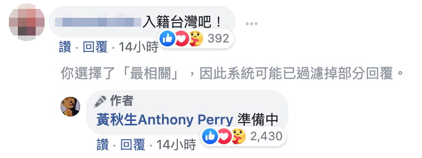 ▼對於大家的熱烈關心,他也發文回覆表示,謝謝大家的關心,因為他目前正在居家隔離中,要遵守規矩,不能透露其他太多相關的細節,獲得許多台灣網友的熱烈歡迎,「歡迎大飛哥來台灣」、「歡迎當台灣郎」、「熱烈歡迎光臨」、「祝福身體健康」、「歡迎來台灣,真希望能巧遇」。