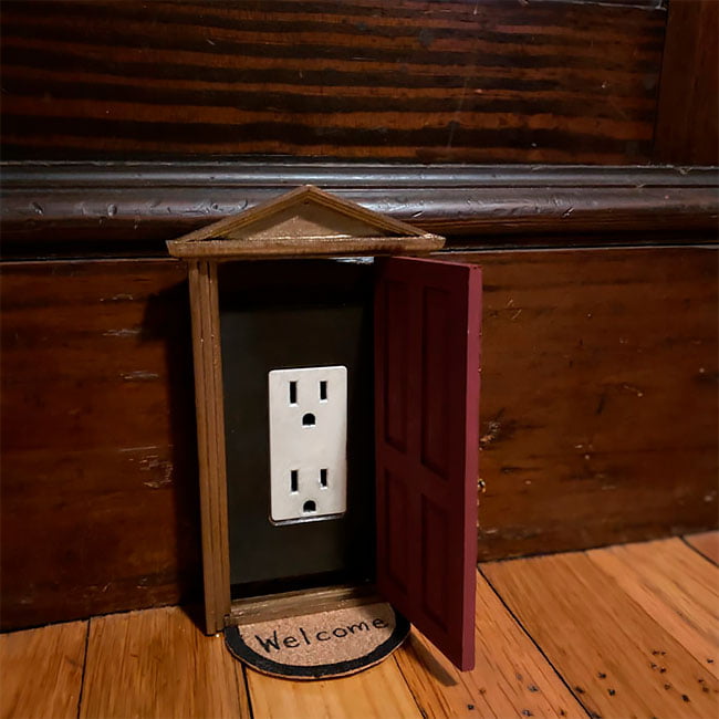 2020年05月28日你家中的插座,可能是通往童話世界的隧道!國外手作達人Cristina在電源插座外加裝了一扇微型小門。這扇小門非常精緻,深紫色的門板搭配棕色的門框,上面還有金色的門把手,看起來很有質感。