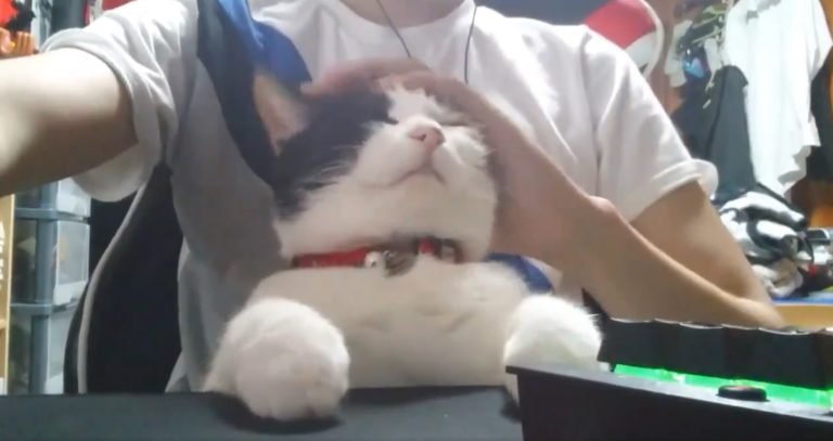 實況中...神萌喵「乖坐懷裡」陪玩 「山竹手」模擬敲鍵盤:我也很厲害喔!