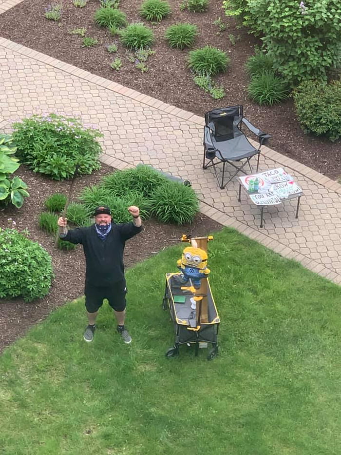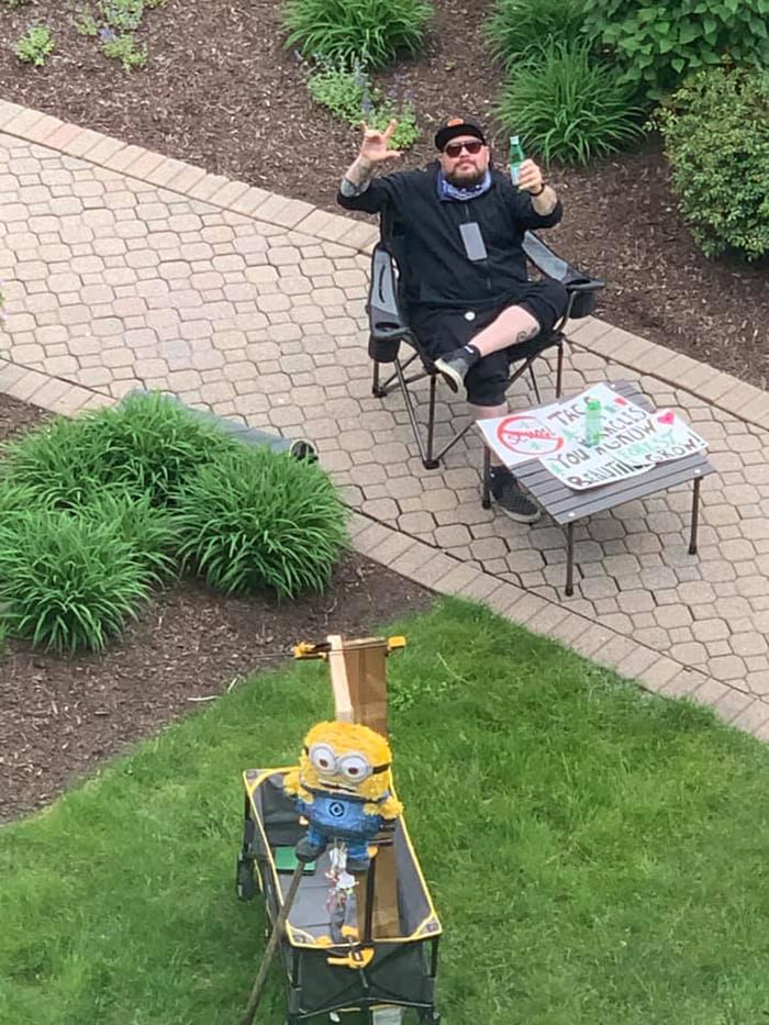 ▼每到約會的時間,Conlin會提前從兩人喜歡的餐廳訂餐,帶著食物、飲料來到醫院,拜託醫護人員交給Moeller。他會在Moeller房間的窗下擺上桌子,舉起標語牌向太太示愛。兩人透過視訊共進晚餐。