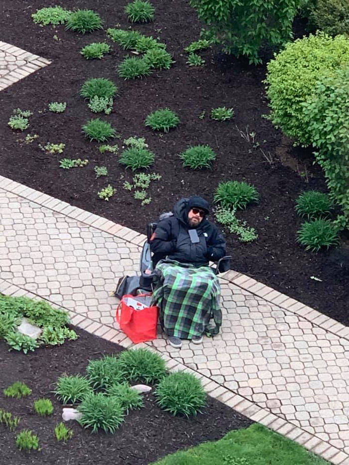 ▼剛開始Moeller以為兩人只能透過視訊見面,沒想到轉頭看向窗外,竟看到丈夫坐在那裡。