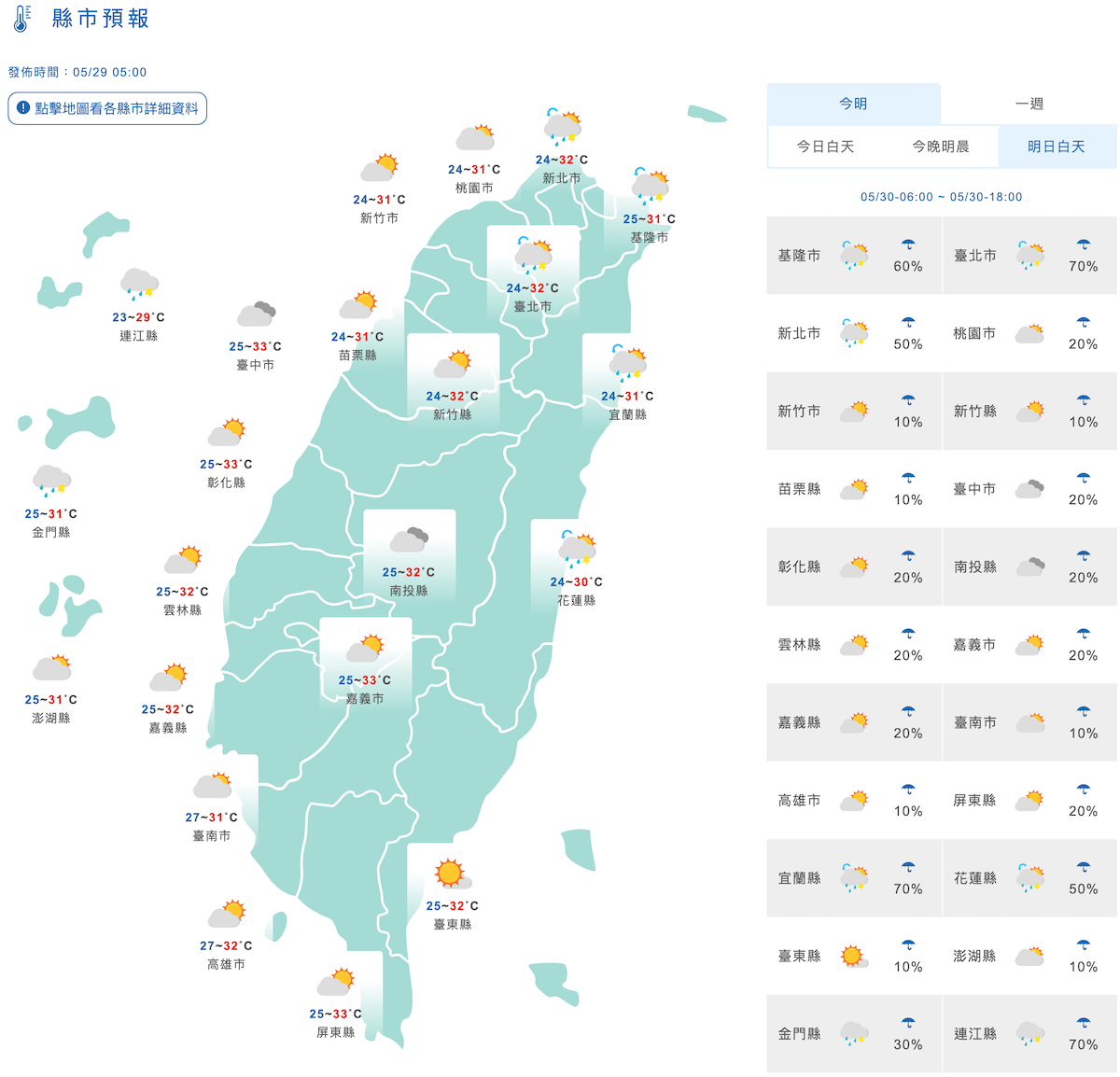 ▼中央氣象局在稍早已解除大雨特報,並指出仍要多留意氣象特報等即時訊息,但29日晚上之後天氣會逐漸趨緩,轉為穩定,好天氣會持續到下星期三(6月3日),各地多雲到晴,高溫會到30到34度。