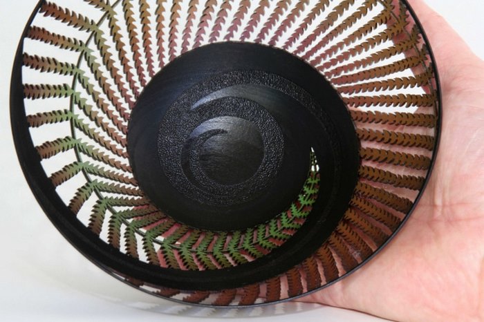 ▼Gordon Pembridge創作木雕作品使用的木材,大多來自被風吹倒的樹木。他先用車床製作出大概的形狀,再用雕刻機一點一點雕琢出複雜的圖案。