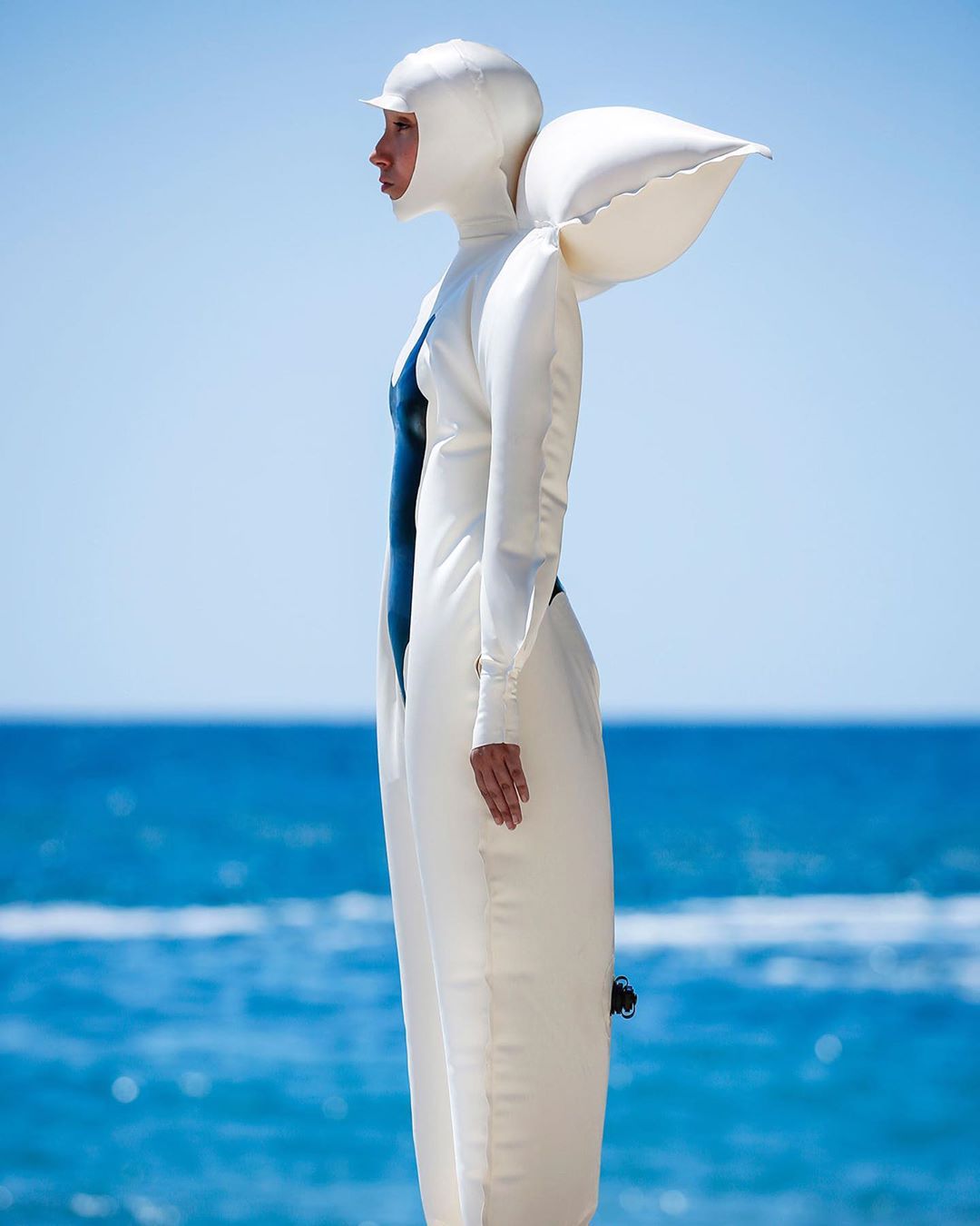 ▼這款名為「FLOATING ABOVE LIMITS」,純白色的泳裝加上全身充氣囊,讓你可以隨心所欲地在大海中飄浮!