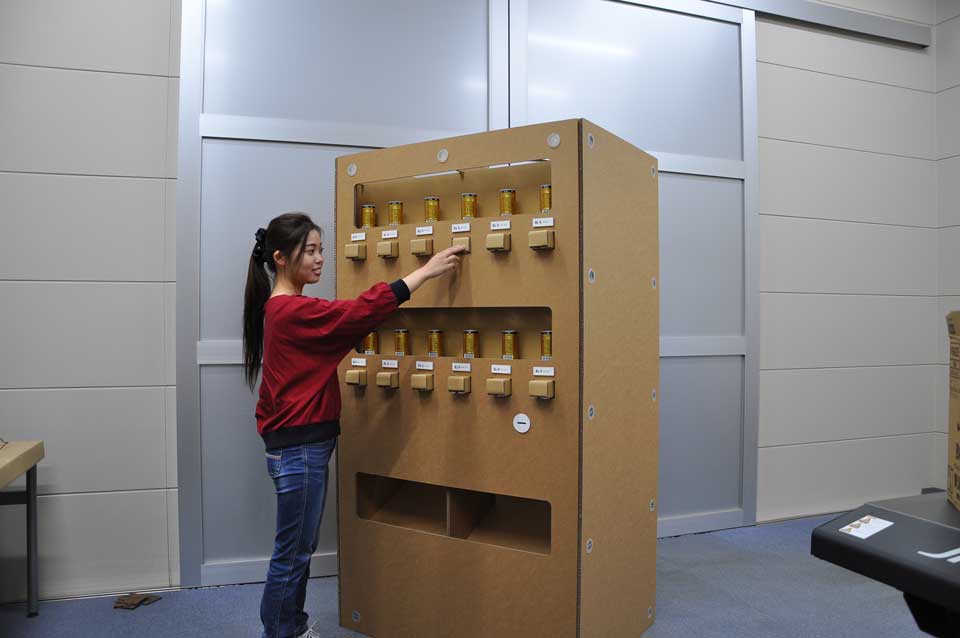 ▼這台紙箱自動販賣機的原理非常簡單,裡面有橡皮筋做成的機關。不過因為不插電,這台機器沒有保溫的功能,大家只能從中拿到常溫的飲料。而且機器是紙箱做的,不能淋雨,只能擺在室內,所以用途比較有限。
