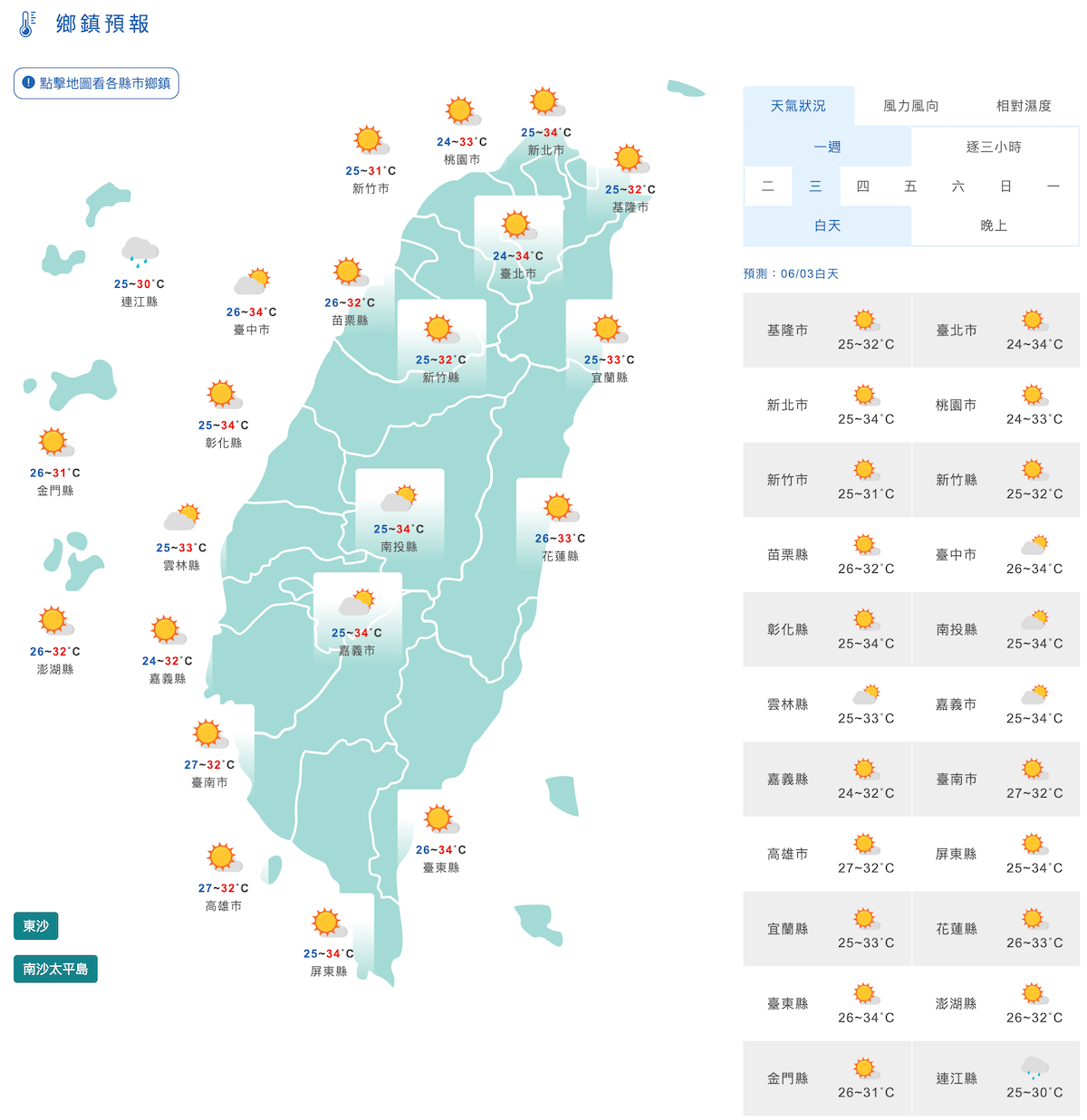 ▼梅雨季的第3波鋒面,週六起漸漸南下,可能會在週日(6月7日)或是下週二(9日)報到,需要再持續的觀察。根據中央氣象局報導,週三至週五(3日到5日)各地大多為多雲到晴,山區、東北部、北部午後可能會有局部短暫雷陣雨,氣候穩定,各地炎熱,高溫會達約35度,甚至有機率局部會更高溫來到36度。