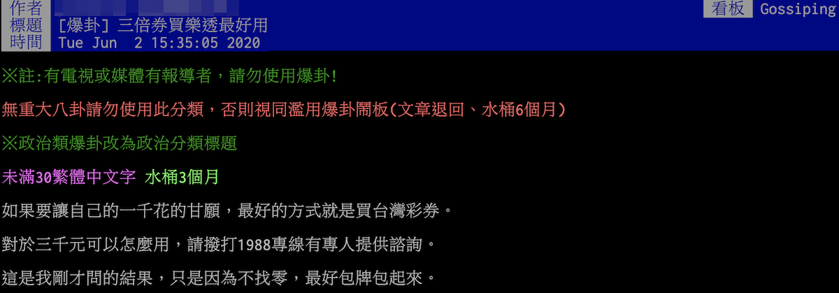 2020年06月03日最近大家對於「振興券」、「三倍券」的議題討論都十分關注,在PTT上就有網友提出「三倍券買樂透最好用」這個主意,獲得眾網友的熱烈回應,大家七嘴八舌討論用三倍券買彩券的效益。