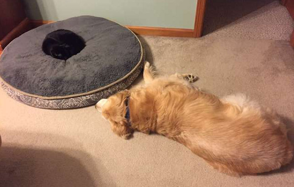 ▼Zeus和Sam在同一個屋簷下生活多年,早就成為了莫逆之交。Zeus很熱情,最喜歡跟在狗狗身後,有時討抱抱、有時玩鬧。溫和的Sam比較包容,哪怕貓咪耍賴搶走自己的窩,牠也不會發脾氣,而是睡在旁邊陪伴著。