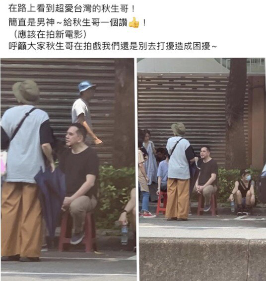 ▼有網友在臉書社團裡面分享他拍到的照片,並表示「在路上看到超愛台灣的秋生哥!簡直是男神~給秋生哥一個讚!」也觀察認為黃秋生應該是在路邊等待戲劇的拍攝,所以原PO也沒有過去接近。