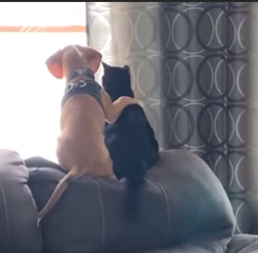好麻吉無誤! 貓貓看風景汪汪跳沙發「霸氣式摟肩」:你在看什麼呀~