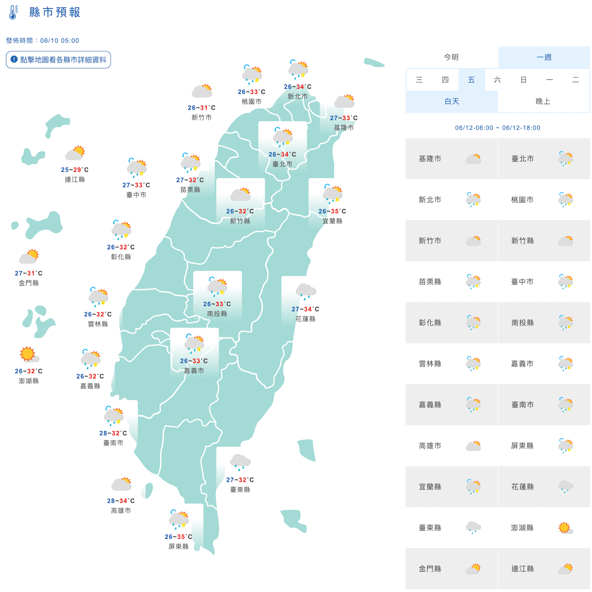 ▼週五至週日(12日到14日)東南風會帶來水氣,花東和恆春半島有局部短暫陣雨,其他地區多雲到晴;西半部仍普遍炎熱,高溫有達35度左右。下週一、二(15日、16日)風向轉為較偏西南風,也會帶來不少水氣。