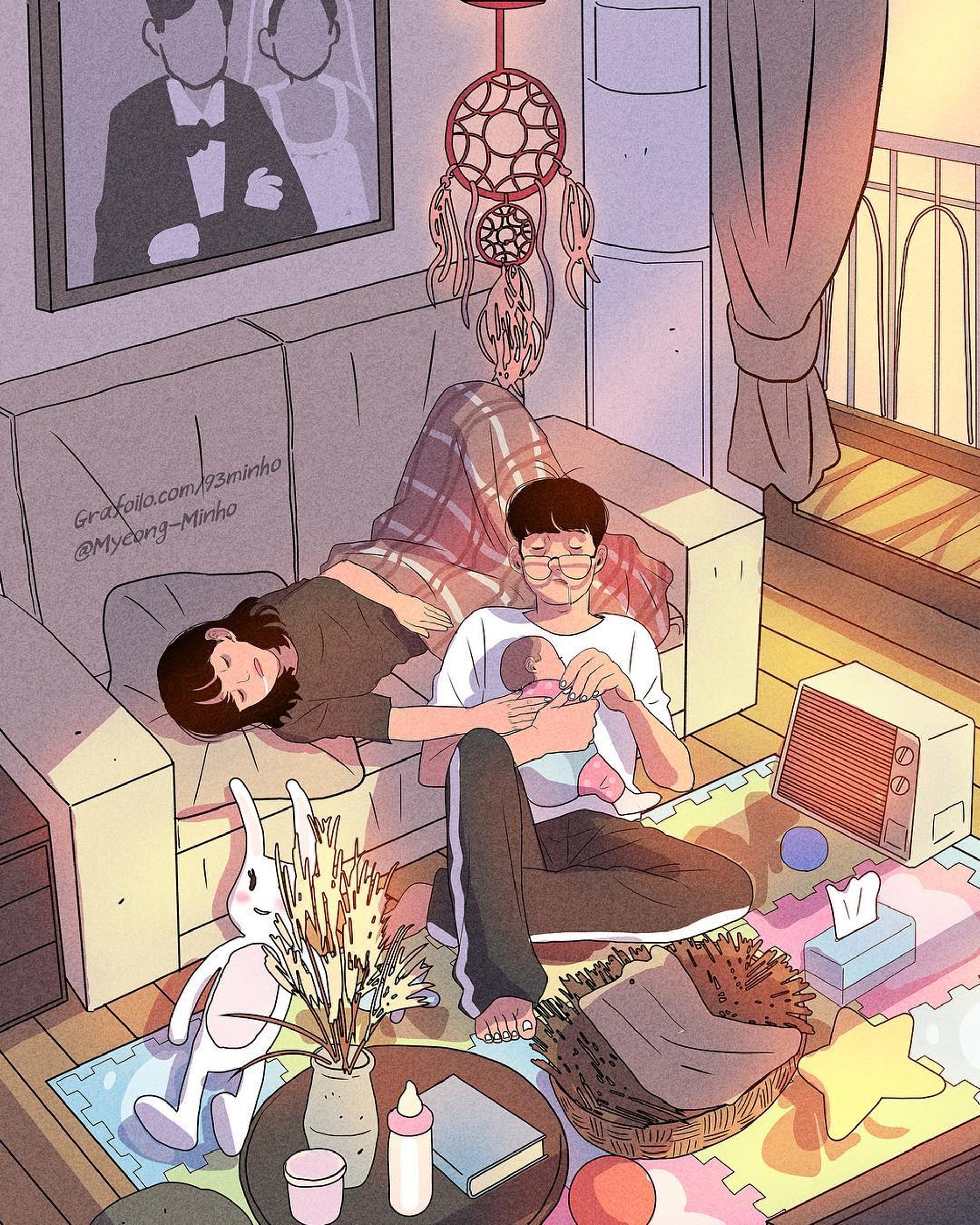 2020年06月16日對真正相愛的人來說,感情是體現在日常生活中的。韓國插畫家「명민호(Myeong-Minho)」在SNS上人氣非常高,他擅長用清新的風格描繪情侶的幸福日常。最近他的作品中出現了新角色,那就是可愛的寶寶。這對小夫妻的帶娃日常也非常幸福,看起來很療癒。