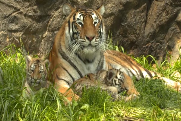 ▼準備完畢後,虎寶寶們就能到戶外玩耍啦。牠們第一次來到戶外有點緊張,但很快就開始到處探索。Mugung看到馬麻在水池裡玩,還想跑去玩水,馬麻為了牠的安全好幾次把牠叼上岸。